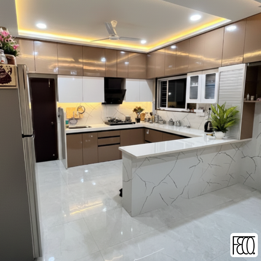 The Caramel Quartz Suite is a masterclass in contemporary kitchen design, where cozy, organic tones meet sleek, high-end finishes. This kitchen is designed for those who appreciate a space that feels both professionally modern and welcomingly warm. The highlight of the suite is the seamless integration of high-gloss cabinetry and bold, marble-veined surfaces, creating a multi-dimensional look that glows under integrated lighting.